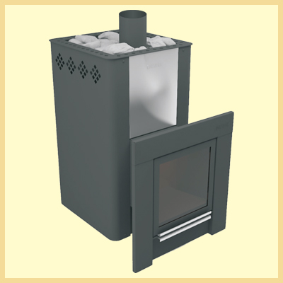 КПД этой печи-каменки из конструкционной стали очень высок благодаря наличию специального пламягасителя, который не позволяет теплу «уходить в трубу» – в результате вся тепловая энергия расходуется на обогрев камней. Наличие кожуха конвертера помогает более эффективно распределить тепло, исходящее от разогретых камней, по всему помещению парной. Дровяная печь может быть укомплектована выносным топочным тоннелем, а значит, устанавливать ее можно не только непосредственно в парной, но и в соседнем помещении, имеющим с парной общую стену.