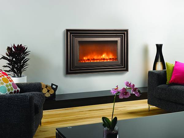 Замечательный настенный электрокамин в черной металлической рамке цвета «металлический багет»,