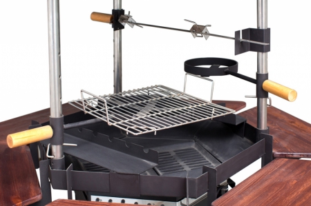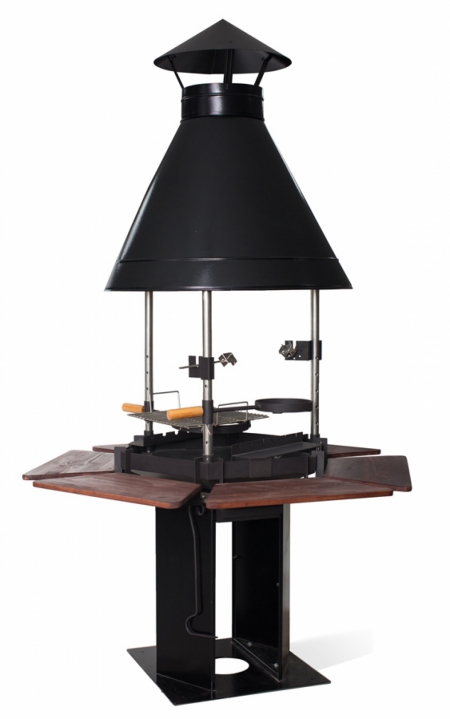 Очаг шестигранной формы. Комплектуется стойкой очага, дымовым колпаком на стойках (колпак можно подвешивать на цепях к крыше), дымовым зонтиком. Представляет собой готовый комплект для установки на улице. Может устанавливаться в центре беседки и использоваться, в том числе, и в качестве стола, т.к. снабжен шестью навесными легкосъемными деревянными пристольями (из дерева лиственных пород) достаточно большой площади. На гриле можно приготовить не только шашлык или блюда барбекю, но также плов и многое другое. Корпус очага изготовлен из стали толщиной 3 мм и окрашен термостойкой эмалью. Для повышения долговечности в корпус очага уложены чугунные колосники. Масса гриля 105 кг.