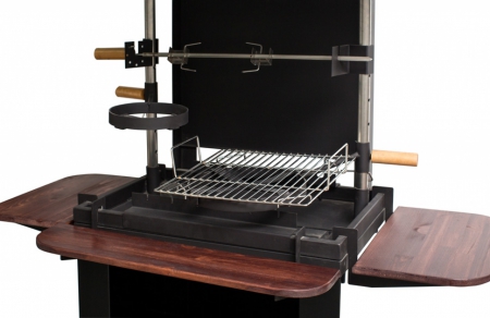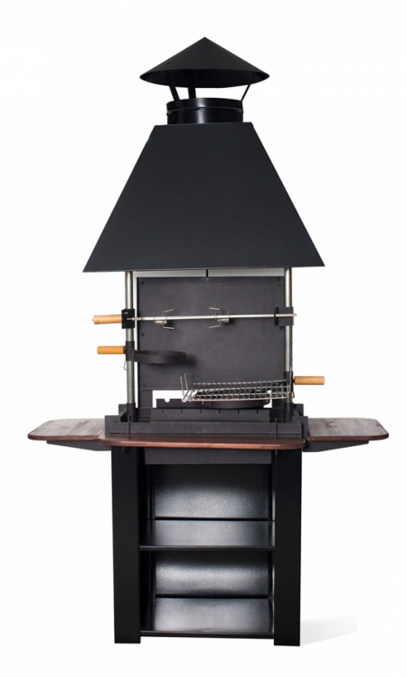 Очаг прямоугольной формы размерами 700х500 мм. Комплектуется стойкой очага, дымовым колпаком на стойках, дымовым зонтиком. Представляет собой готовый комплект для установки на улице. Может устанавливаться в беседке, снабжен 3 навесными легкосъемными деревянными пристольями (из дерева лиственных пород) достаточно большой площади для удобства приготовления блюд. Корпус очага изготовлен из стали и окрашен термостойкой эмалью. Для повышения долговечности в корпус очага уложены чугунные колосники. Стойка очага, дымовой колпак и элементы системы дымоудаления (трубы и пр.) окрашены порошковой эмалью. Масса гриля 95 кг.