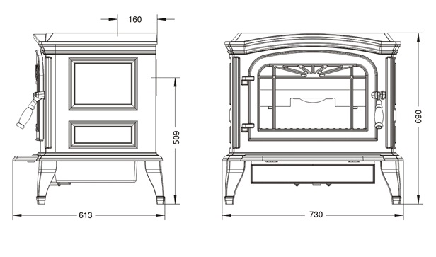 Мощная и элегантная печь. Двойные чугунные стенки, обеспечивающие максимальную надежность и безопасность. Ящик для сбора золы максимально облегчит чистку печи. За счет большой топливной камеры достигается большая мощность. Две регулируемые подачи кислорода в топку. Первая регулировка подает воздух для горения через зольный ящик, что способствует легкому розжигу дров. Вторая регулировка подает воздух для горения сверху непосредственно на стекло. Это служит очистке стекла от копоти и дополнительному сжиганию дров в верхней части топливной камеры. Печь способна без труда отопить внушительных размеров гостиную. С помощью грамотного специалиста вы дополнительно сможете обогреть мансардный этаж.