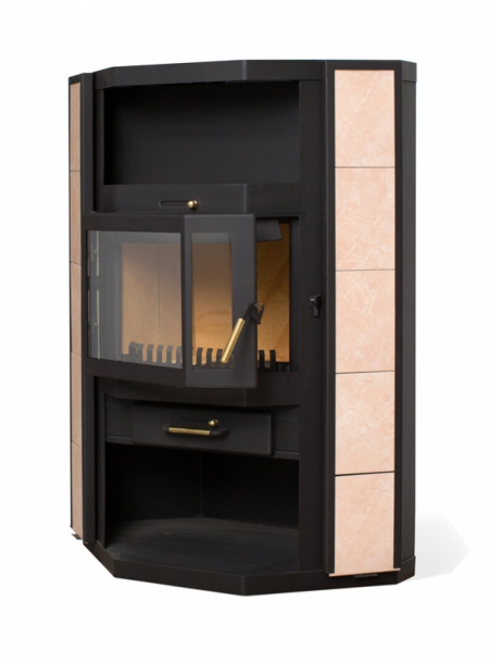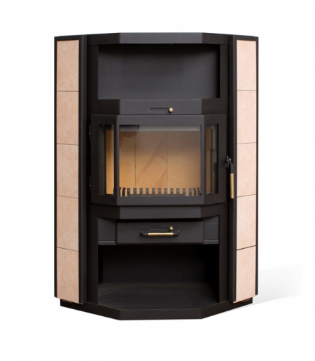 Пристенно – угловая печь с панорамным обзором. Идеально подходит для обогрева помещения площадью 45-90 м2. Призматическая дверка из трех стекол высотой 330 мм. В отделке боковых поверхностей может применяться разнообразная керамическая плитка, керамогранит, окрашенный металл. По заказу может поставляться в сером или черном цвете. Размер поленьев 30 – 50 см Подсоединение к дымоходу сверху.