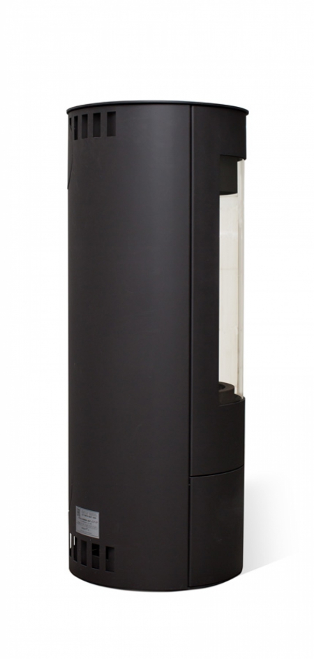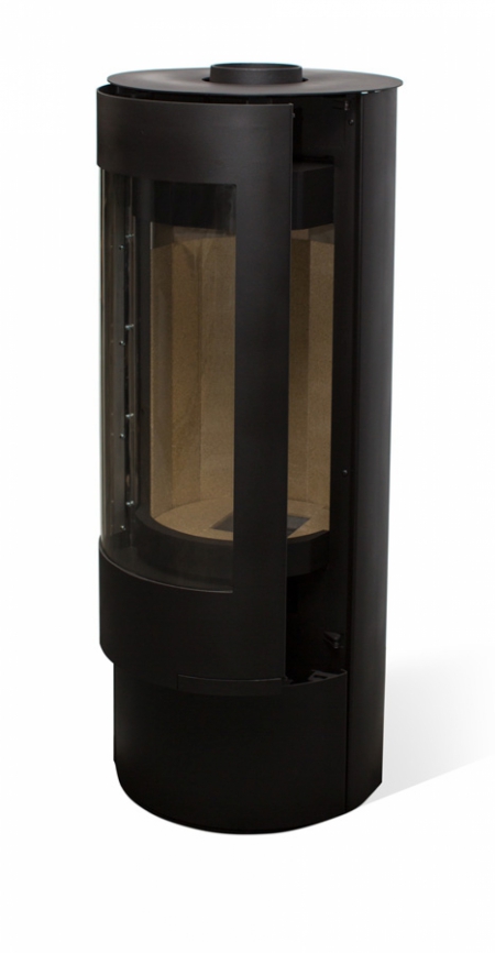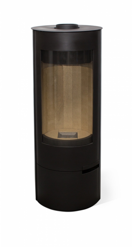 Каминная печь Мета-Бел Селигер. Свободностоящая высокая круглая печь в современном европейском дизайне. Печь оборудована высокой радиальной дверкой с большим радиальным стеклом. Дверка выполнена в одной плоскости с корпусом печи. Ручка утоплена в плоскости дверки. Закрываемый дровяной ящик.