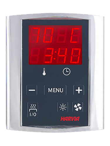 Пульт управления Harvia Griffin CG170 – для печей общей мощностью до 17 кВт. Диапазон настраиваемой температуры – от +40 до +110°C. Пульт контролирует время работы электрокаменки, Температуру в парном помещении, а также возможно, при необходимости, контролировать освещение и вентиляцию.