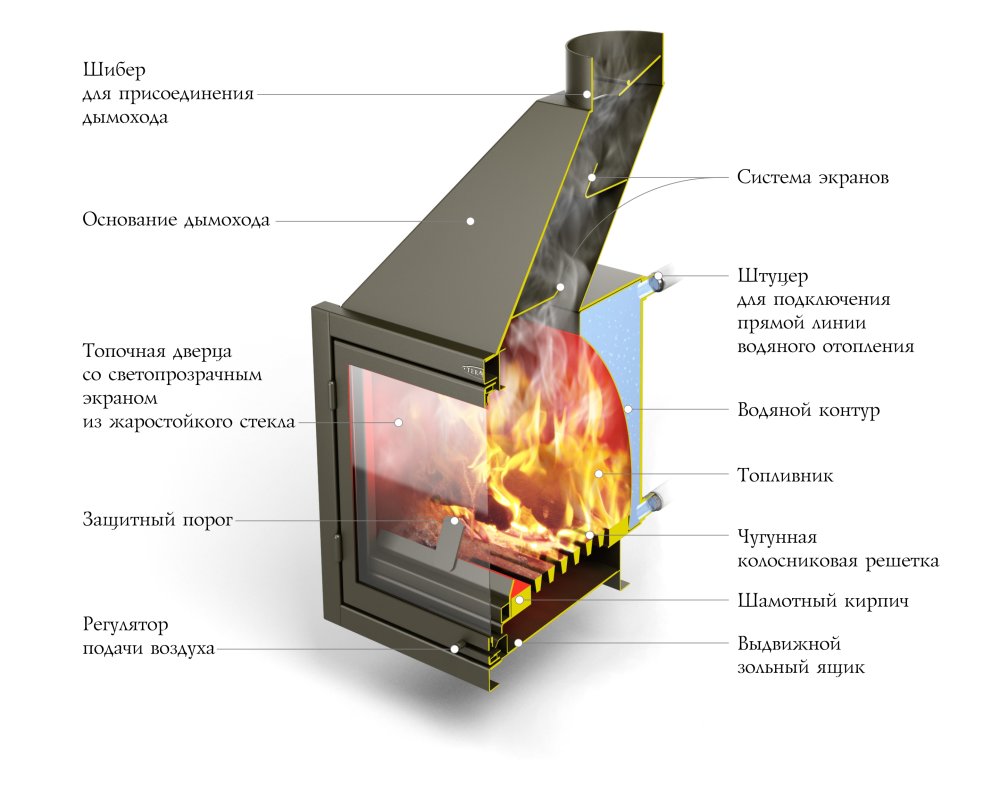 Топка имеет две модификации: с теплообменником (для подключения открытой системы отопления) и без теплообменника. В модификации без теплообменника набор конвективных труб способствует лучшему нагреву помещения.